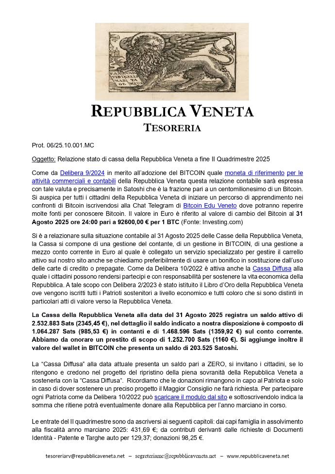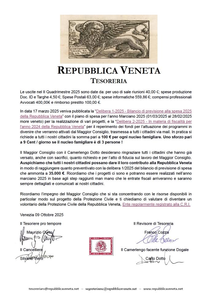 Caro Cittadino della Repubblica Veneta, nell'assolvere il proprio mandato e come da regolamento, la Tesoreria con proprio documento pubblica la relazione di Cassa della Repubblica Veneta certificata per il II Quadrimestre 2025 con le sue conclusioni e approvata nella riunione in presenza del Maggior Consiglio del 11.10.2025.